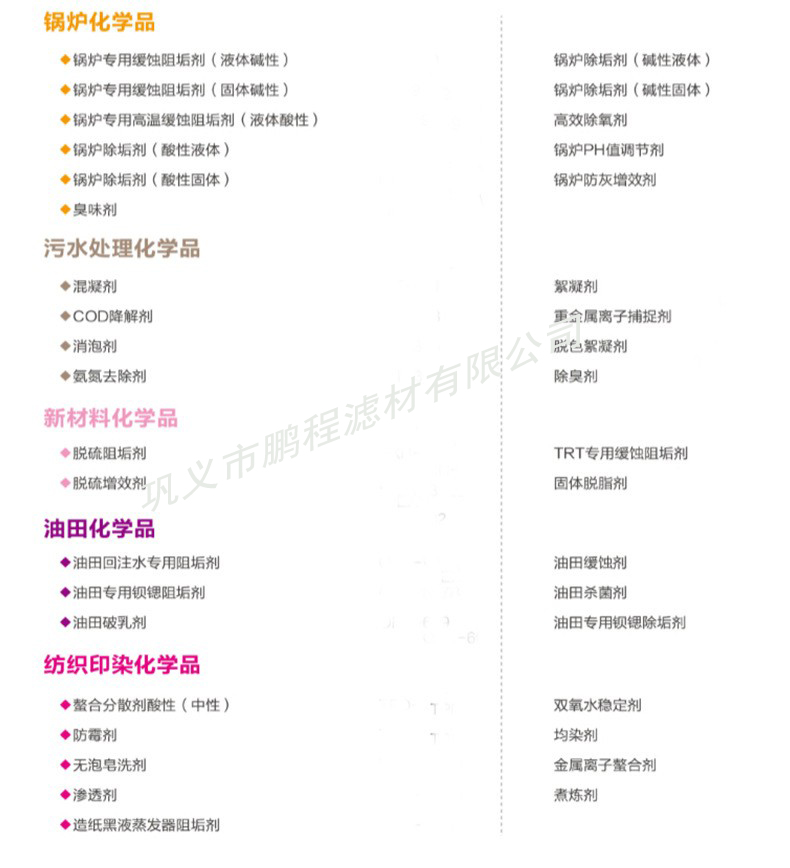 阻垢劑 清洗劑 還原劑 剝離劑 消泡劑——水處理劑廠家 鵬程濾材1月17號(hào)正式放假