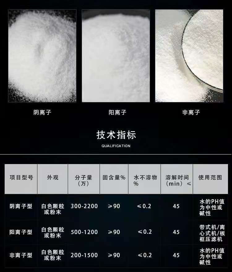 在配合使用中,先加入帶正電荷的無機絮凝劑,使污水中的膠體脫穩(wěn),在加入帶負電荷的陰離子聚丙烯酰胺。