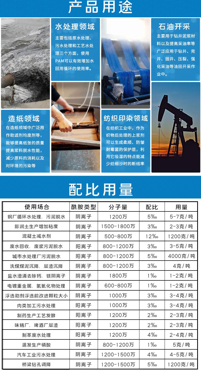 陽離子聚丙烯酰胺通過交聯(lián)吸附的網(wǎng)狀結(jié)構(gòu),作為了一類重要的絮凝劑  增稠劑  減阻劑  泥漿處理劑 表面活性劑 土壤改良劑,水土保濕劑 造紙 印染紡織增強(qiáng)劑等;在石油開采  水處理 紡織造紙 選礦 醫(yī)藥等行業(yè)中廣泛用到。所以被稱之為 百業(yè)助劑。