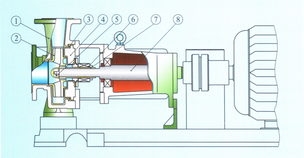 IHF泵的泵體采用金屬外殼內(nèi)襯聚全氟乙丙烯(F46),葉輪、泵蓋均采用金屬嵌件外包氟塑料整體燒結(jié)壓制成型,軸封采用外裝式波紋管機(jī)封,封環(huán)選用99.9%碳化硅,動(dòng)環(huán)采用四氟填料或碳化硅。該泵具有結(jié)構(gòu)合理,耐腐強(qiáng),密封性能嚴(yán)密,噪音低,壽命長。