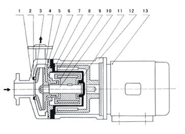 驅動裝置采用主動磁鐵聯(lián)軸器直接裝在電機軸上,泵室完全封閉,通過磁力偶合間接驅動轉子組合上的葉輪旋轉。