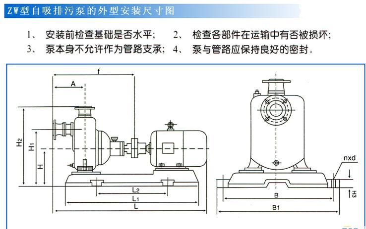 ZW型自吸式無堵塞排污泵(結(jié)構(gòu)圖) ZW型自吸式無堵塞排污泵(安裝尺寸) 一、起動前的準(zhǔn)備與運行 1、檢査泵底座、聯(lián)軸器、軸承座等連接部位的緊固件有否松動?如有松動應(yīng)固緊。