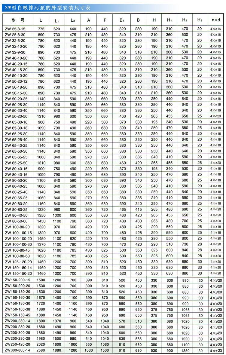 1、自吸式無堵塞排污泵安裝前檢查基礎(chǔ)是否水平? 二、ZW型自吸式無堵塞排污泵(安裝尺寸)