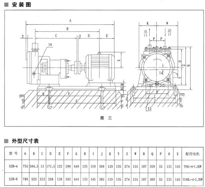注: ![]() 結(jié)構(gòu)圖 SZB水環(huán)式真空泵(安裝尺寸): 安裝說明 設(shè)備須根據(jù)圖三進(jìn)行安裝